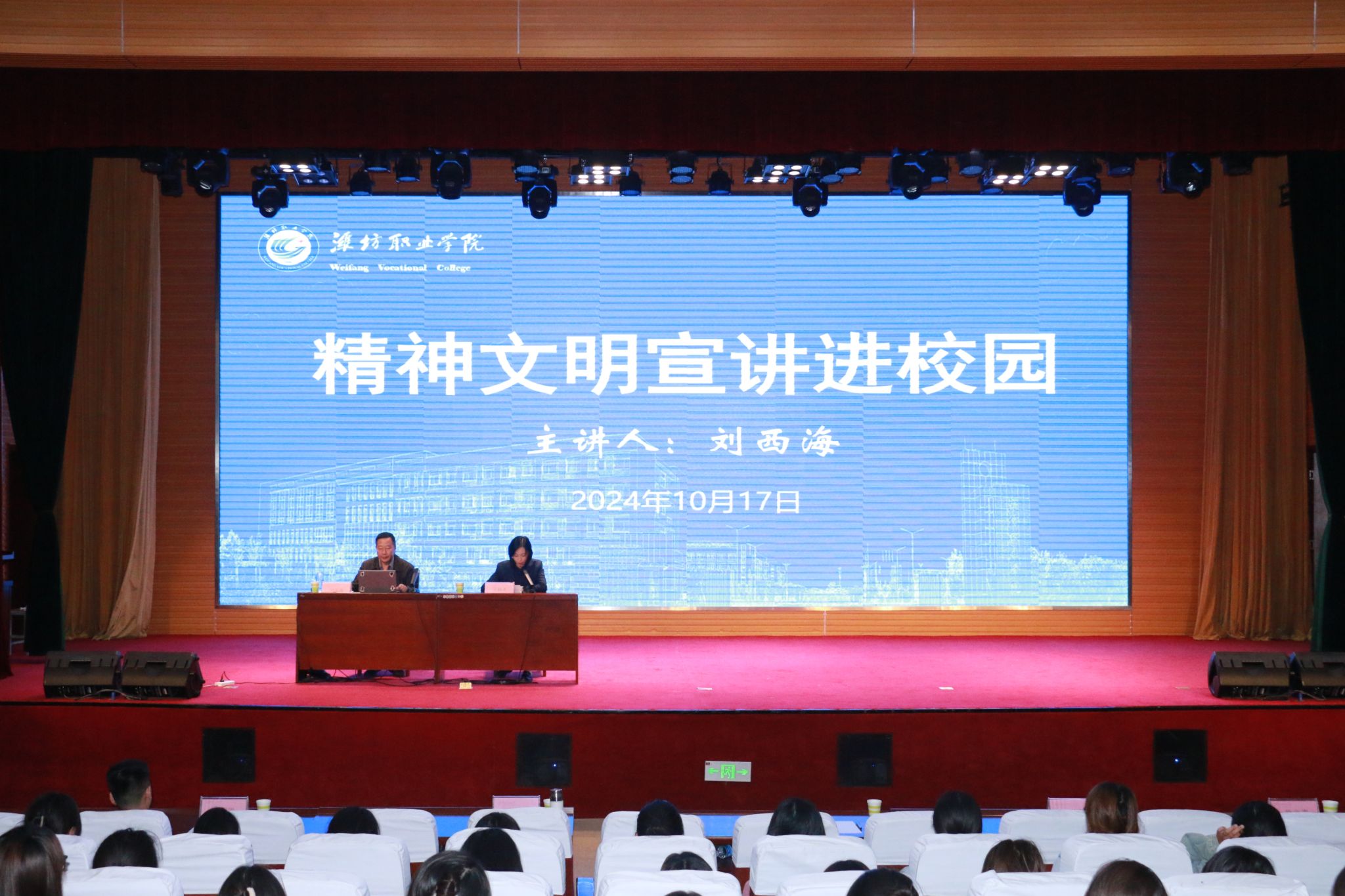为进一步推动精神文明创建工作,落实立德树人根本任务,大力培育和践行社会主义核心价值观,10月17日下午,我院联合校企合作单位潍坊天泽人力资源有限公司邀请潍坊市文明办原副主任刘西海入校开展“精神文明宣讲进校园”活动。活动在图书馆报告厅举行,我院党总支负责人主持,企业代表、辅导员代表及2024级全体新生参加了活动。