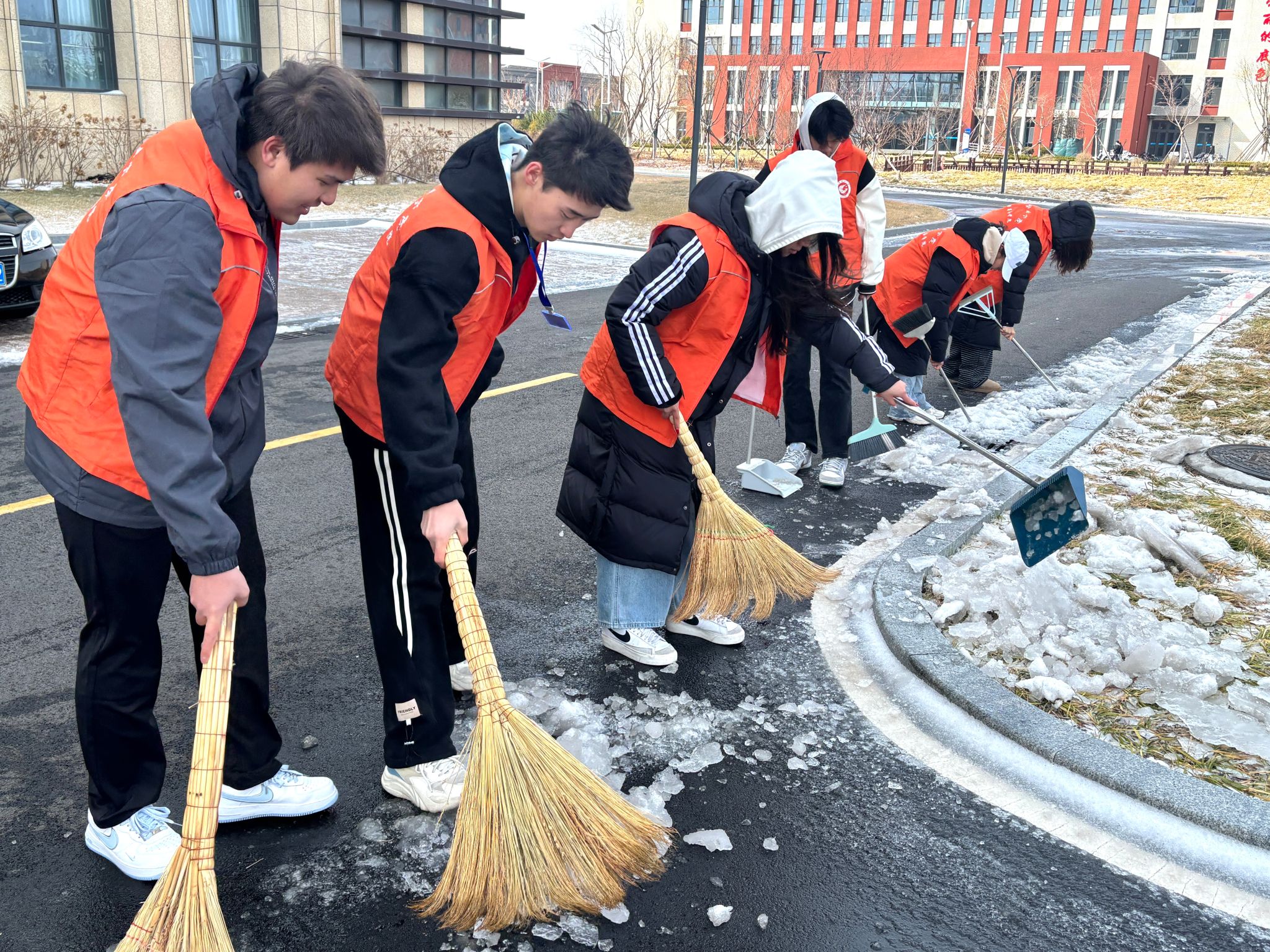 清冰雪,暖人心。天降大雪后,国际商务学院开展扫雪除冰志愿服务活动。青年志愿者们不畏寒冷,拿着扫帚、簸箕、铁铲等工具,齐心协力清理了教学楼出入口和综合楼背阴处的积雪和冰块,为师生正常出行消除安全隐患,提供安全保障。经过一个多小时的劳动,校园积雪区域被志愿者们清扫得一干二净,恢复了顺畅的出行交通,为师生营造了安全的出行环境。