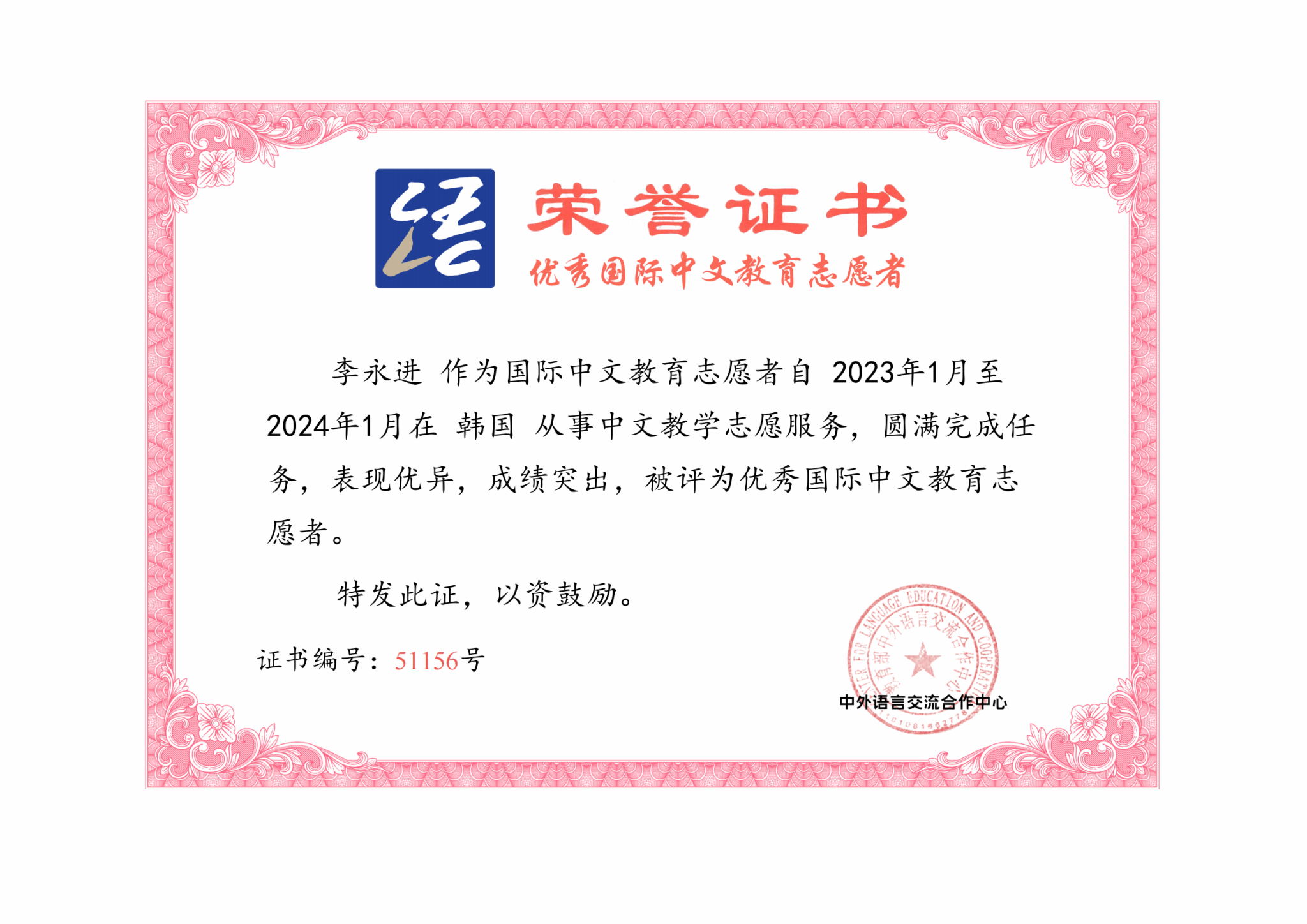 近日,教育部中外语言交流合作中心(以下简称“语合中心”)公布了2023年度赴韩国优秀国际中文教育志愿者名单,我院李永进老师在150余名志愿者中以综合测评第二名的成绩荣获“优秀国际中文教育志愿者”称号。