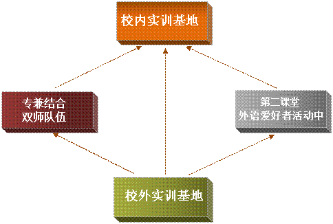 高职教育的职业性、岗位性、实用性对高职学生的实习、实训工作要求很高,国际商务学院特别重视实践条件的建设。为保证实习实训的顺利进行,我们制定了实践基地建设计划并组织落实。为提高学生实习实训的效果,我们积极探索实践途径,形成了以校内实训为基础,以外语爱好者活动中心和第二课堂为依托,以校外实习为核心,以行业企业专家参与、培养高素质的双师素质教学队伍为保障的实践教学系统。为改善实习实训条件,提高学生的实际语言能力和职业素养,通过政府支持投入与企业合作的三方融合,为学生创建了一流的外语学习环境。